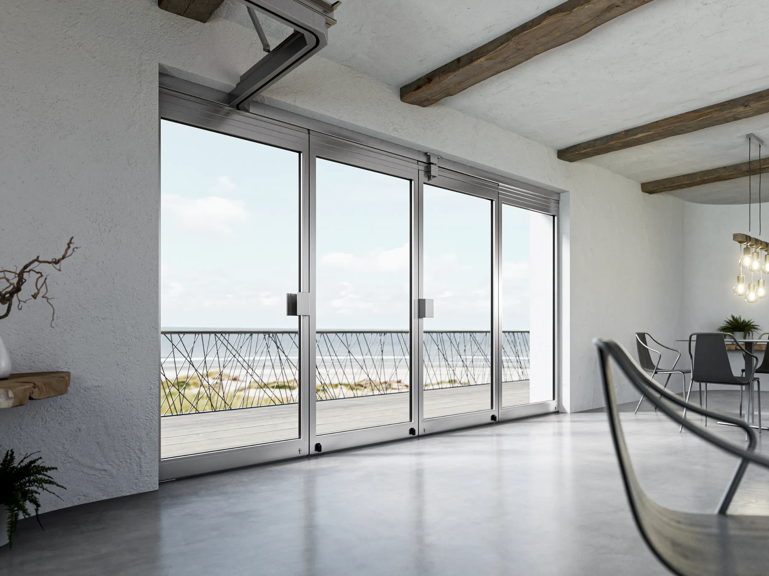 Velkou předností těchto systémů je jejich bezbariérové provedení. Skleněná křídla jsou zavěšena shora, což umožňuje plynulý pohyb bez nutnosti spodního vedení. Podlaha zůstává zcela čistá a ničím nerušená.